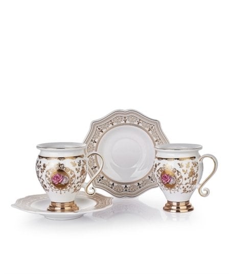 Beyaz porselen üzerine özgün tasarımıyla gold  işlemeleriyle kahve fincan takımı.