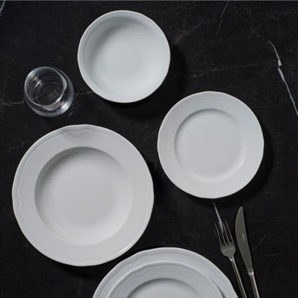 Güral Porselen Venedik 24 Parça Yemek Takımı, porselenin doğal beyaz zarafetini rölyef detaylarla bütünleştiriyor. Klasik çizgileriyle hem modern hem de geleneksel sofralara uyum sağlarken, sade tasarımıyla yemeklerinizi ön plana çıkarıyor.