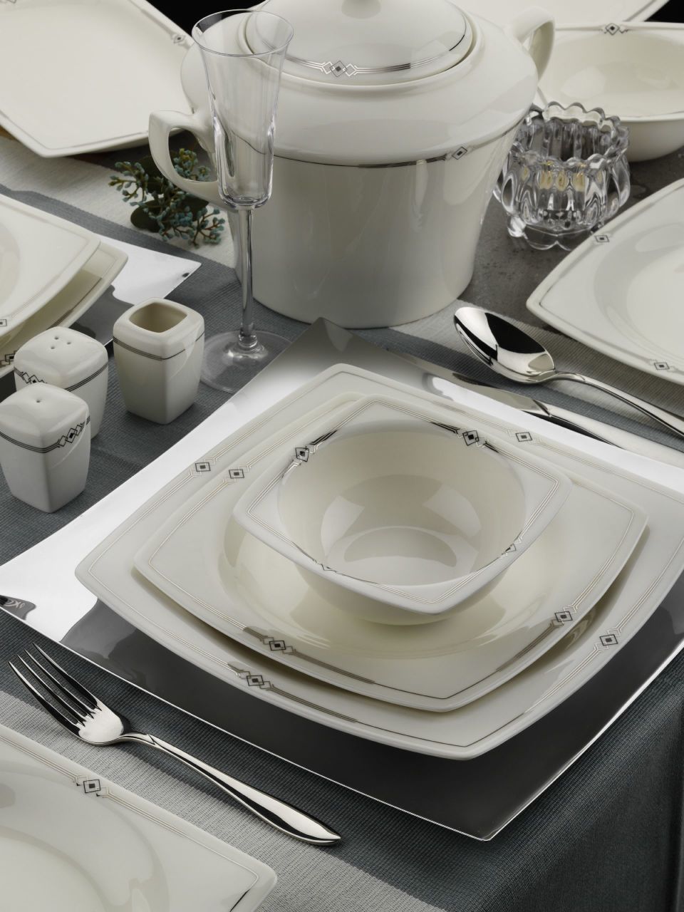 Kütahya Porselen Bone Mare 62 Parça 10605 Platin Desen Yemek Takımı